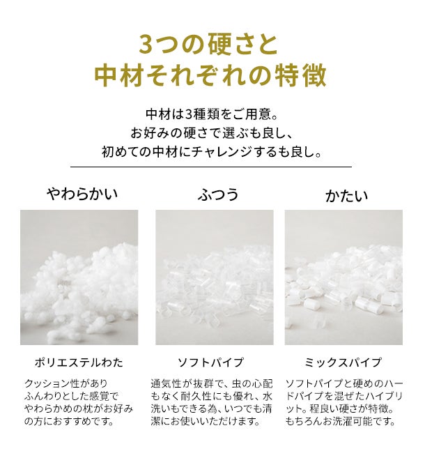 ・中材ポリエステル100%綿/ソフトパイプ・ミックスパイプ(ポリエチレンパイプ) ※洗濯機OK(洗濯ネットをご使用ください)
