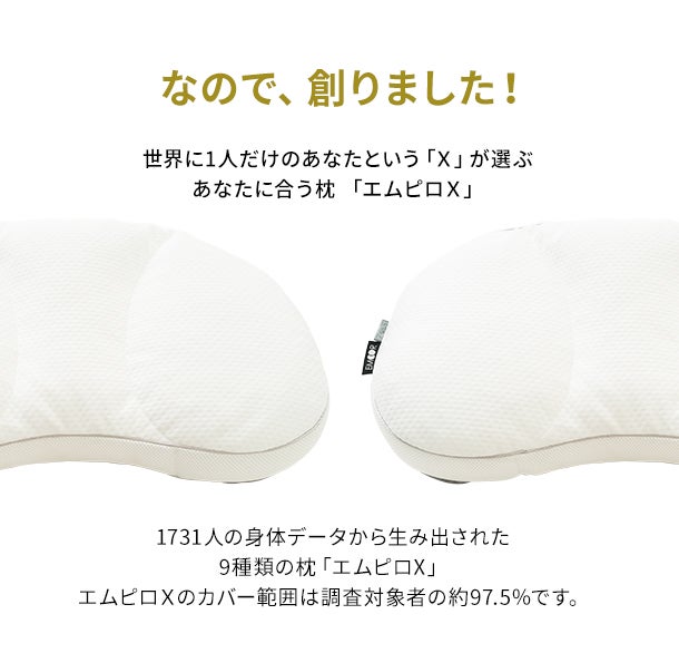 こうして生まれたエムピロXは、専門家や長時間の計測をせずとも、高精度なセレクト&カスタマイズにより、世界でたった一人のあなた専用枕となります。