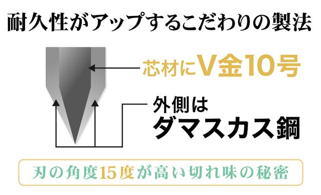- V金10号とダマスカス鋼の組み合わせで鋭い切れ味&耐腐食性が長続き