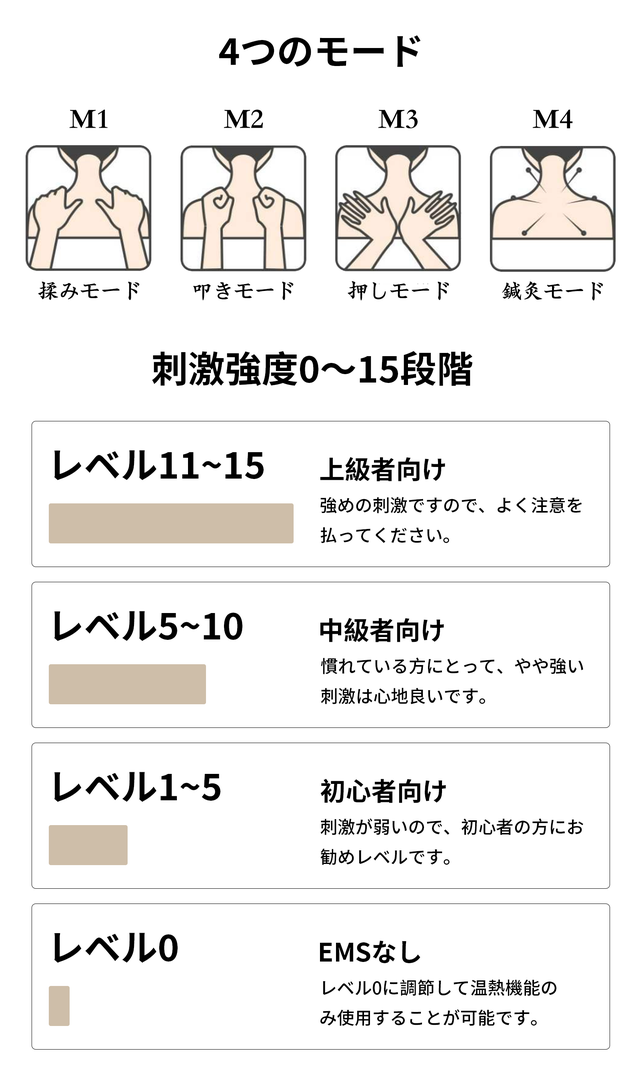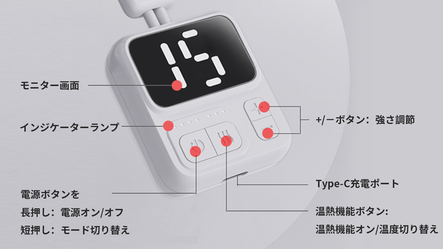 - 4つのモ―ド、15段階の強さ設定で、心地よい温熱刺激を実現