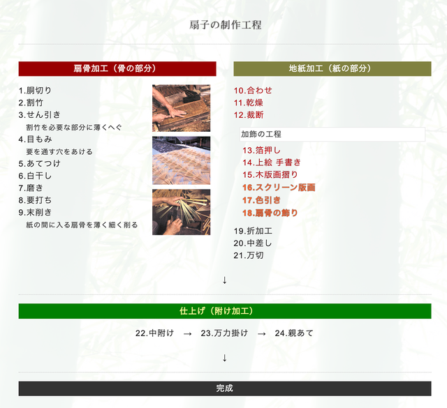 京扇子は分業制で、約87回職人の手を通るといわれています。主には扇骨づくり、紙の加工、紙の加飾加工、折加工そして仕上げ加工に別れており、それぞれの加工の中で、熟練の職人が手作業で丁寧に制作しています。