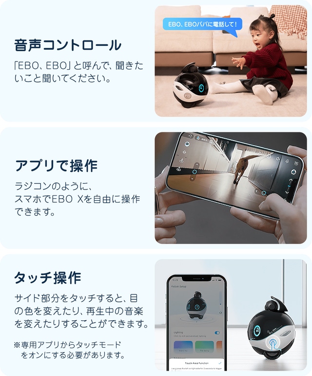 - 離れて暮らす家族やお留守番中のペットも安心!4Kカメラを搭載したEBOが家中をパトロール!