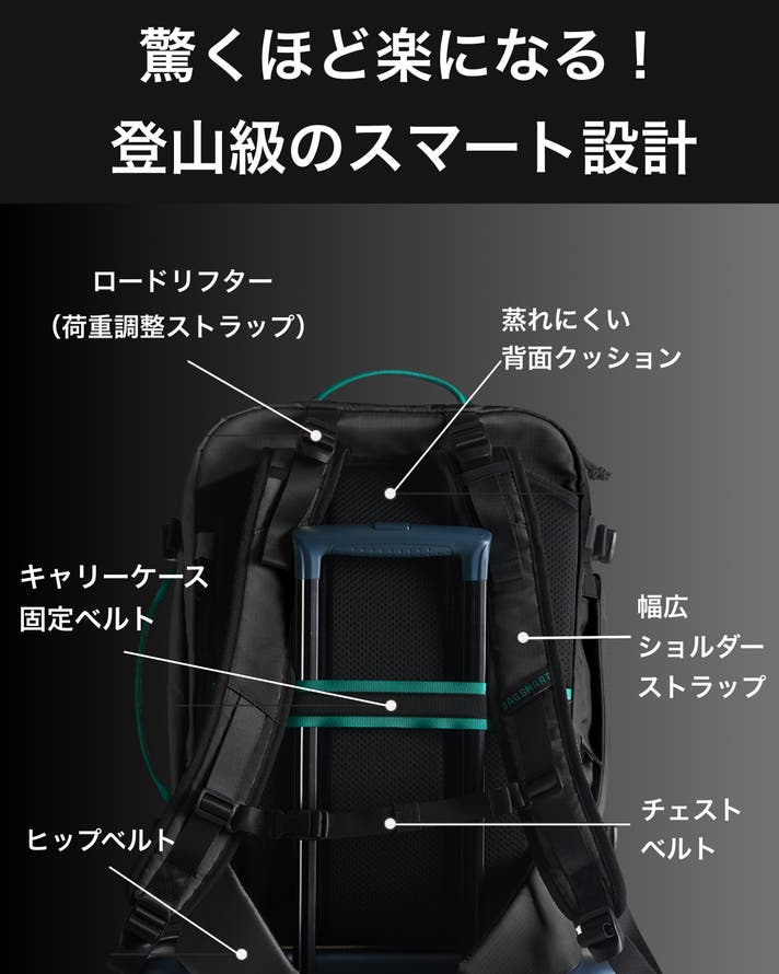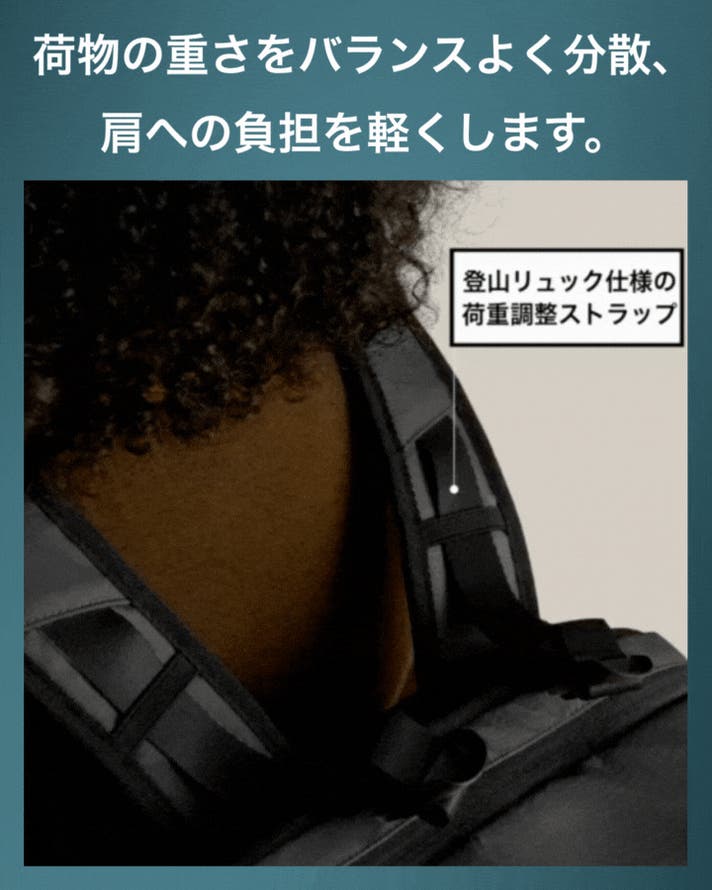 登山リュック仕様のロードリフター(荷重調整)ストラップが重さを分散。