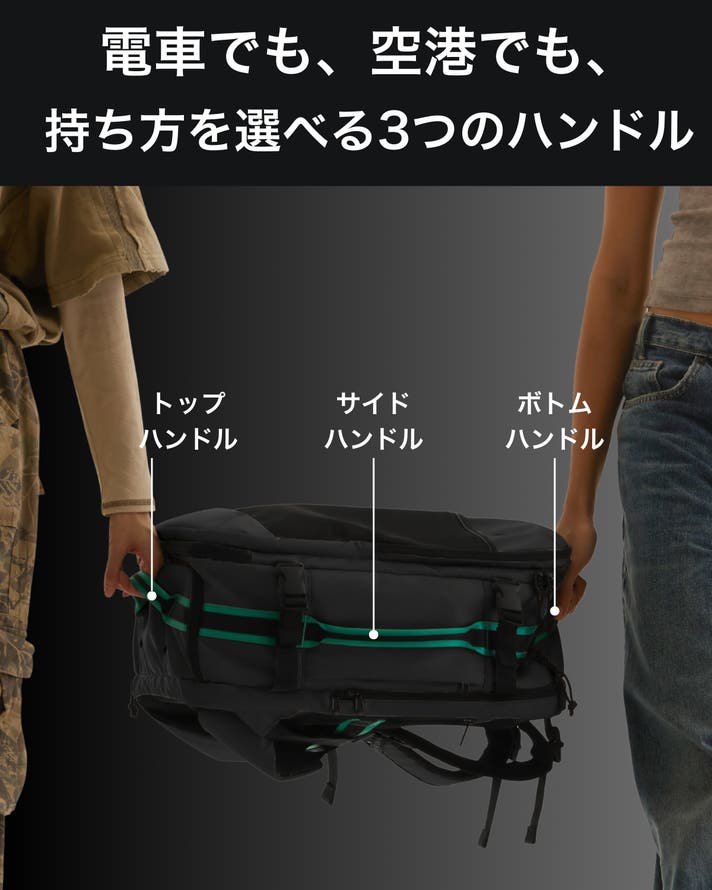 混雑した電車では横に持ち、空港では上に持って素早く移動。荷物棚から取り出すときは下のハンドルが活躍します。シーンに合わせて自在に持ち替えられるから、毎日の通勤から旅行まで快適です。