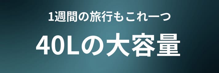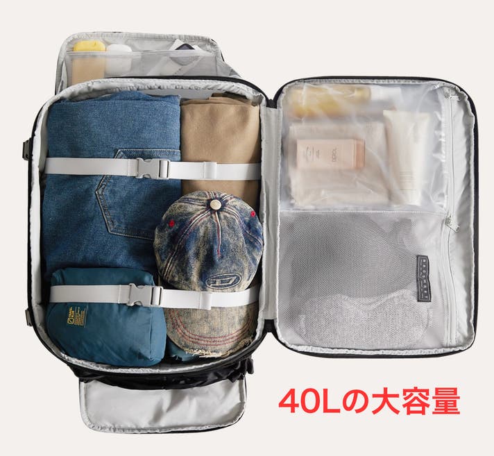 40Lの大容量。衣類やガジェット、日用品まで、3泊以上の旅行や長期の出張にも十分対応できます。