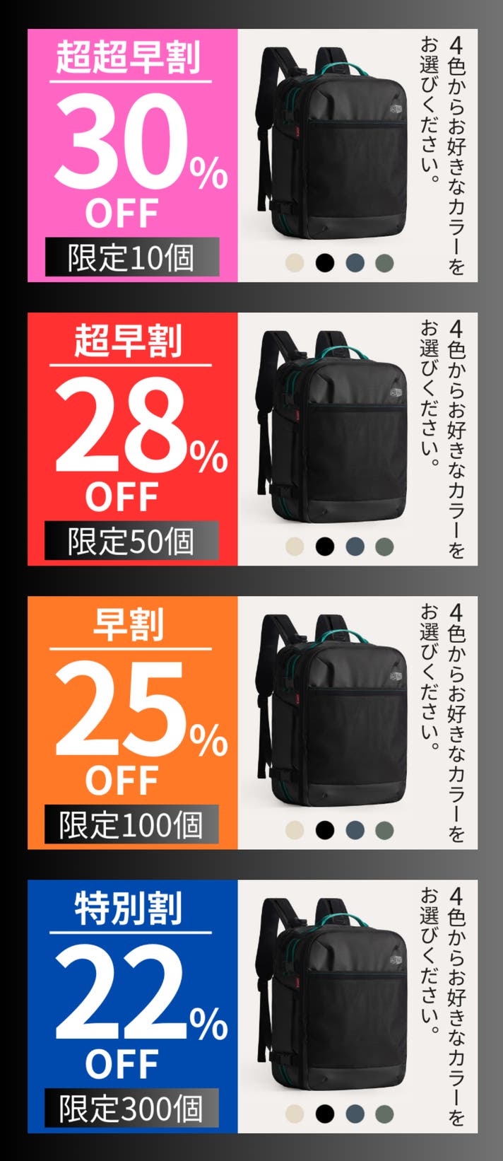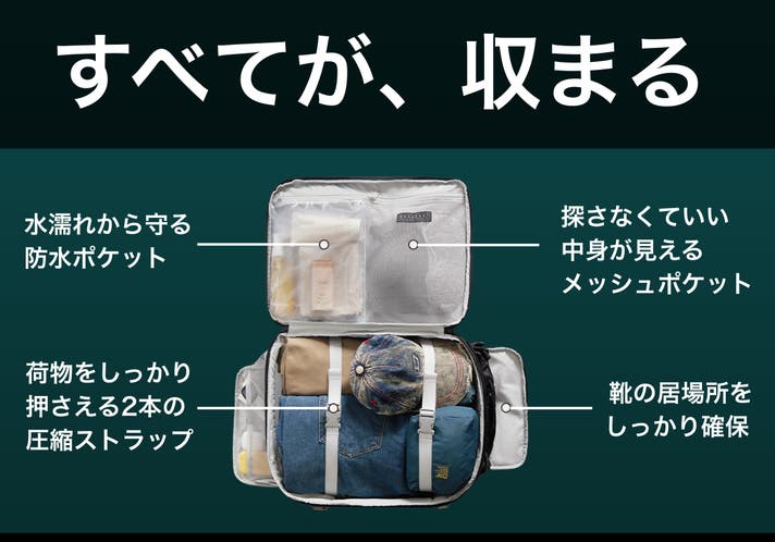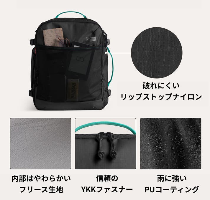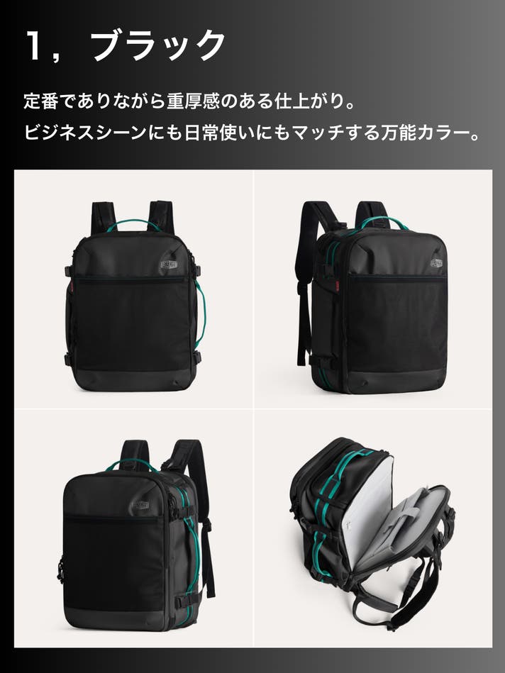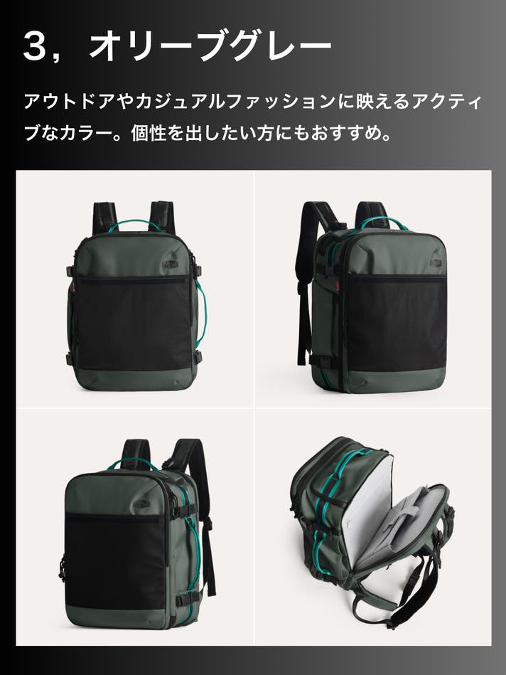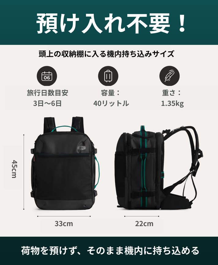 40Lの大容量で機内持ち込みに対応しながら、登山級のプロ仕様で背負いやすく、スーツケースのようにフルオープンできるメイン収納、靴や汚れ物を分けられる換気付きコンパートメント、防水PVCポケット、RFIDブロックポケット、防犯用の隠し背面ポケットなど、多用途に耐えうる機能を搭載しました。