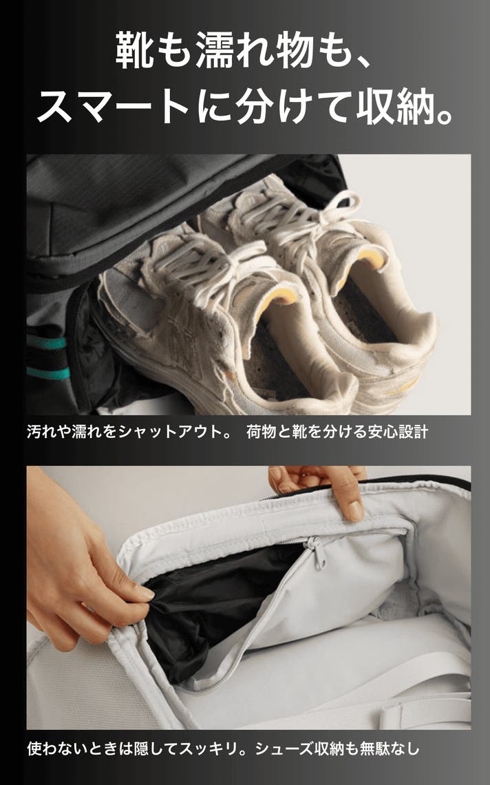 靴や着替えを清潔に分けられる独立コンパートメントで、長旅やジム通いも快適に。