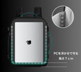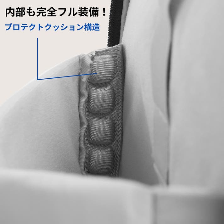 PC収納部は底面から約7cm浮かせる構造で、バッグを床に置いたり落とした時の衝撃を直接受けません。3辺を囲むプロテクトクッションが、移動中の振動や圧力からもPCをしっかり保護します。