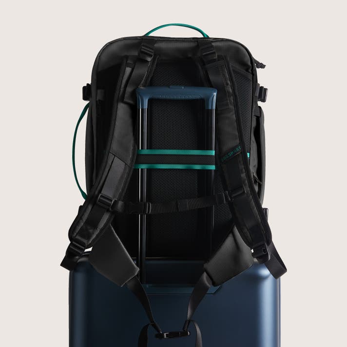 A. どちらにも対応します。サイドの圧縮ストラップで容量を調整できるので、普段はスリムに、旅行では大容量に。さらにキャリーオンベルトでスーツケースにもセット可能です。