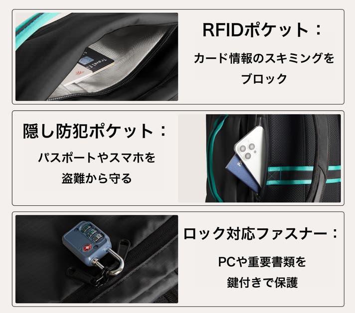 旅先や出張先で心配な、カード情報の盗難やスキミング被害を防ぐRFIDポケットを搭載。さらにパスポートやスマホを守る隠しポケット、PCや重要書類を守るロック対応ファスナーも備え、どこへ行くにも安心です。