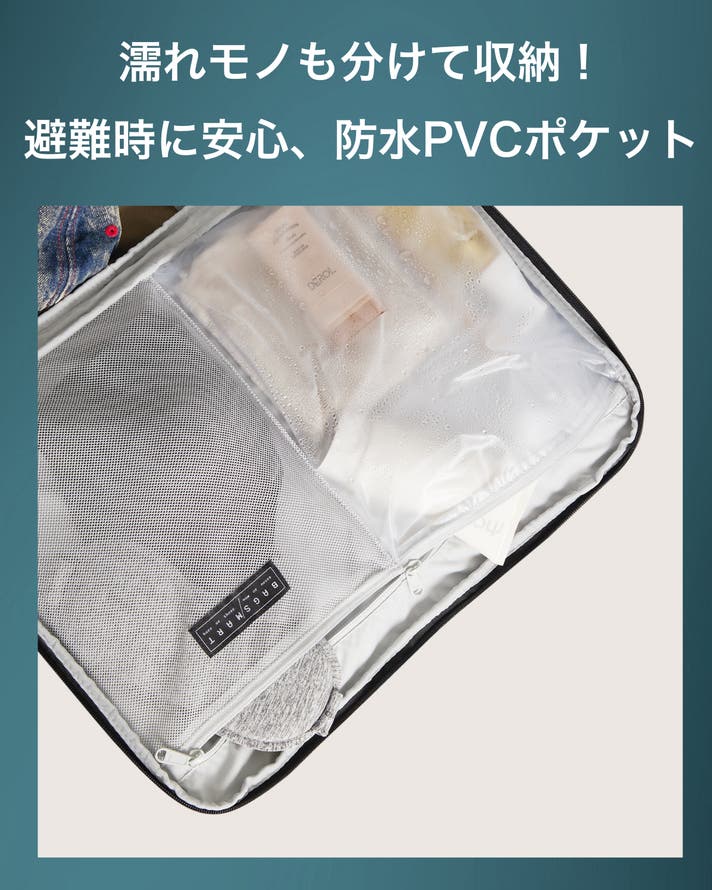 衛生用品はもちろん、防水PVCポケットにライトやバッテリーを入れて、水濡れから防ぐような使い方もできます。