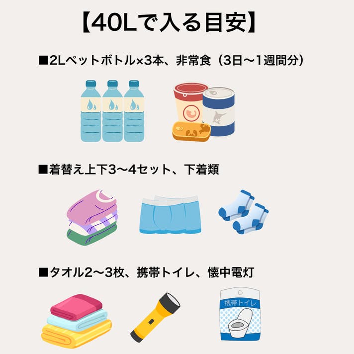 40Lの大容量だから、食料や水・衣類・デジタル機器までしっかり収納。