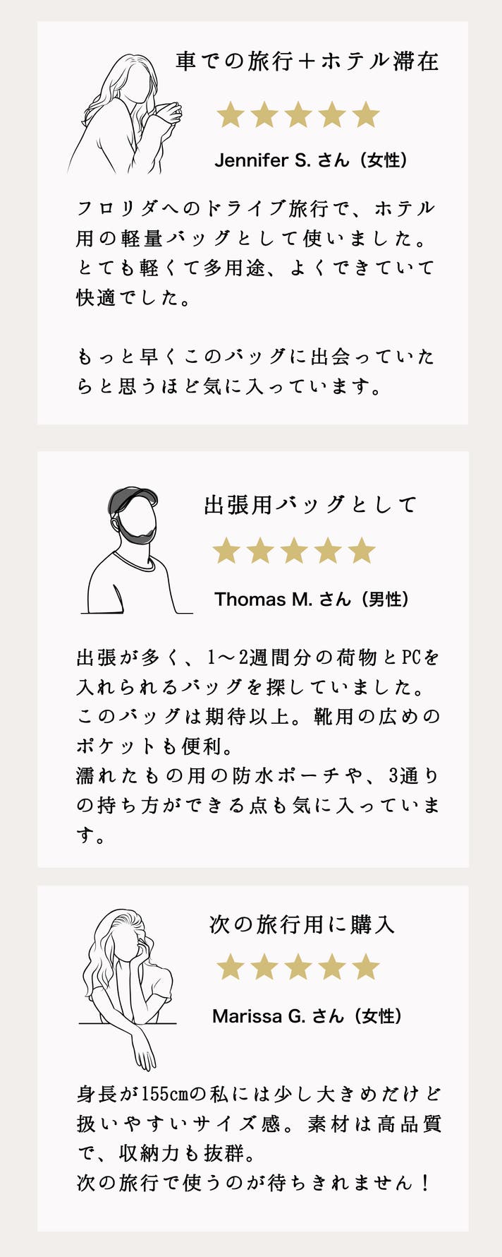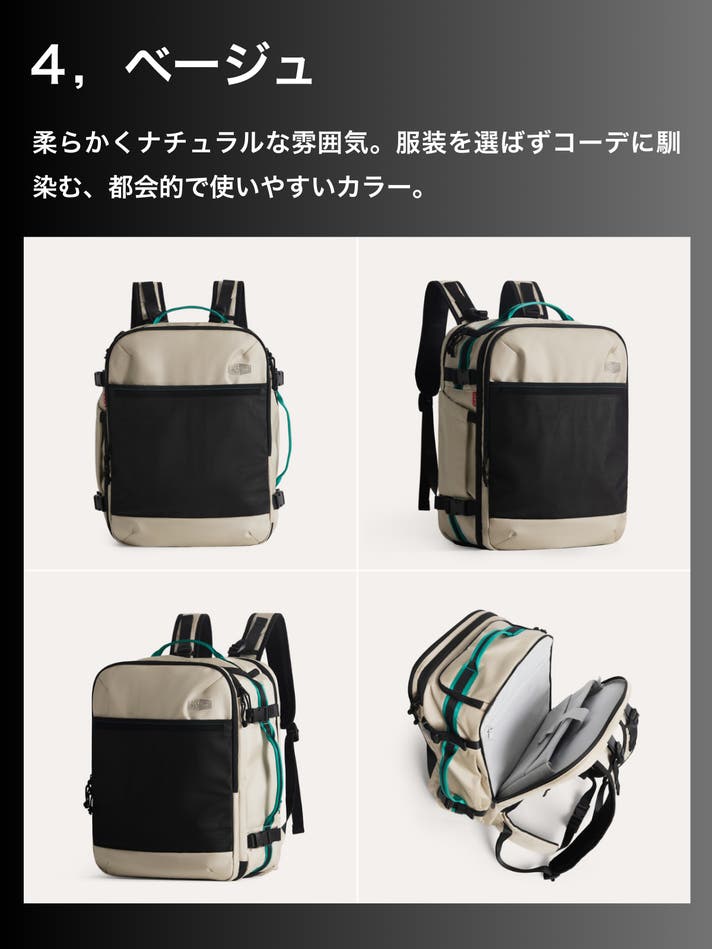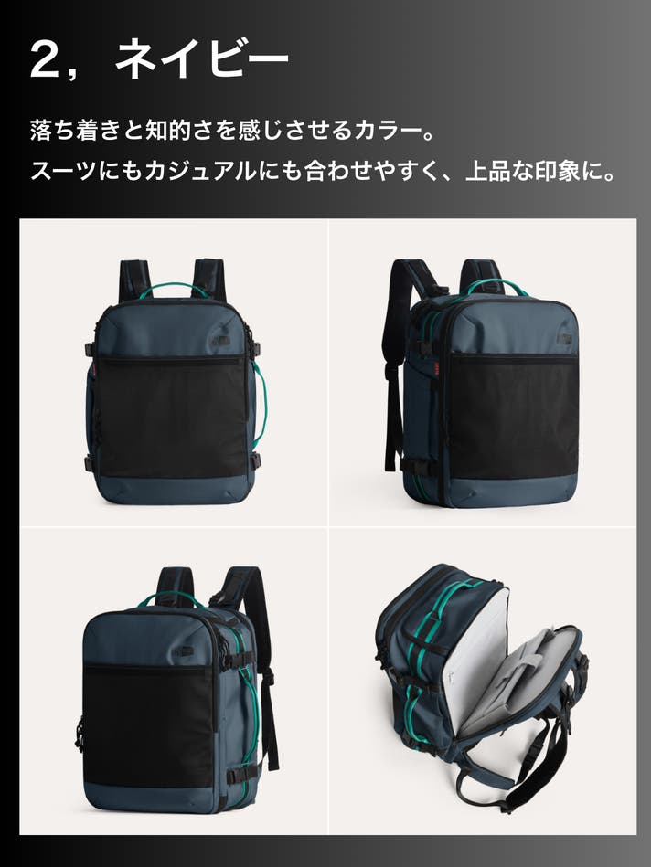 A. 大容量ながらもデザインはスッキリ。通勤やジム通いにも「整理しやすい」「万能で使いやすい」と好評です。小柄な方(身長155cm程度)からも「扱いやすい」との声をいただいています。