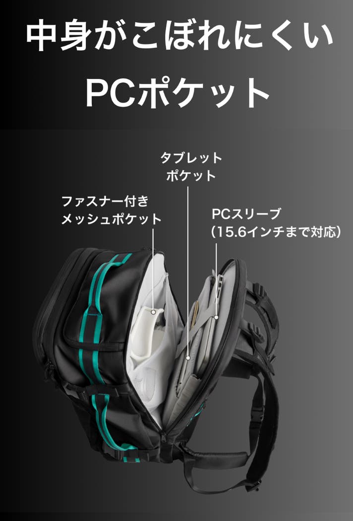 スーツケースのように大きく開いて、衣類もガジェットも整理しやすい。防水ポケットやメッシュポケットも備え、出張や旅行でも荷物がすっきり収まります。