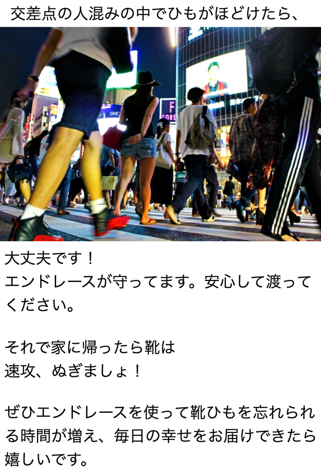 ・写真やビデオに掲載されている靴は、弊社では販売していません。これらは、endlacesを説明するための例で用いています。