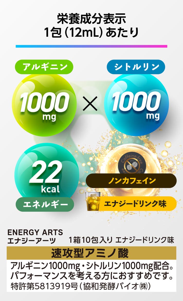 判断を鈍らせない「攻め」の配合。圧倒的な「成分密度」をたったひと口に凝縮。吸収効率を高める特許配合で、僅か12mLにアルギニン1,000mg、シトルリン1,000mg。世界と対峙するアスリートのパフォーマンスをサポート。