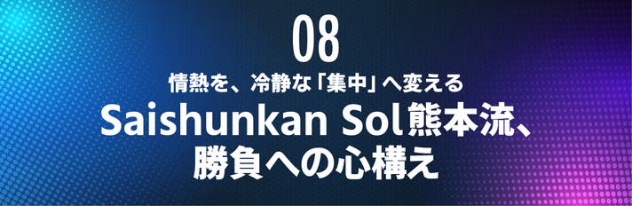 SaishunkanSol熊本流、情熱を冷静な「集中」へ変える心構え理論を携え、私たちは世界と戦うプロたちの「肉声」に耳を澄ませました。激闘の最前線に立つSaishunkanSol熊本のメンバーは、いかにして勝負へのコンディションを整え、極限状態を乗りこなしているのか。