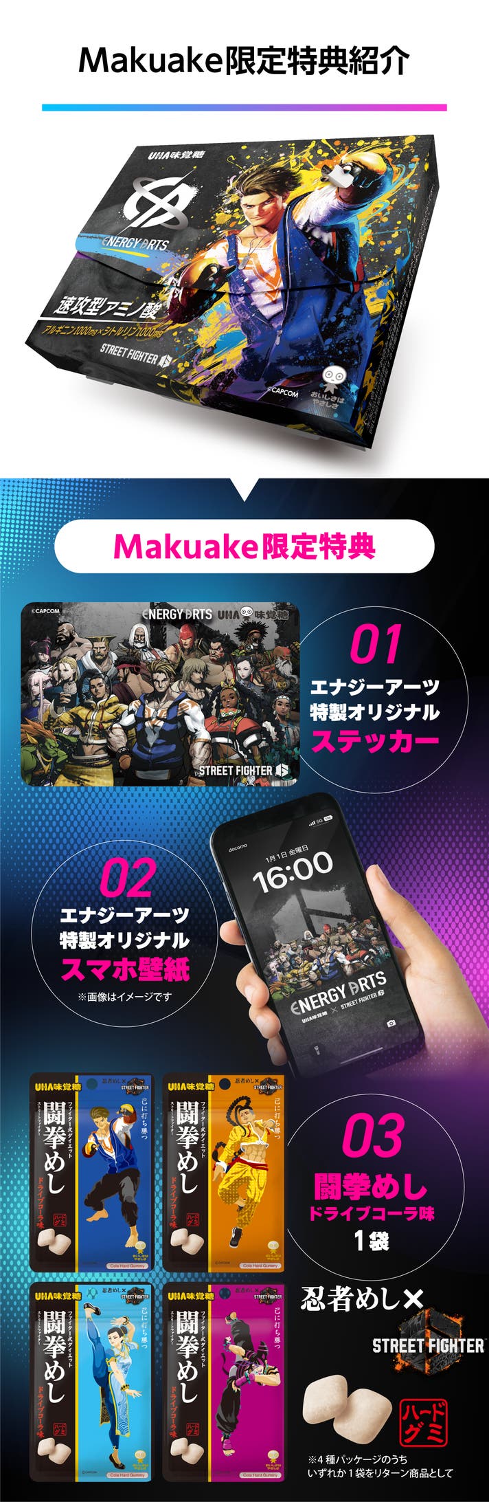 「Makuake(マクアケ)」は、実行者の想いを応援購入によって実現するアタラシイものやサービスのプラットフォームです。このページは、 フードカテゴリの 「【UHA味覚糖】パキッと0.5秒、ノンカフェ濃縮エナジー補給!スト6限定コラボ」プロジェクト詳細ページです。