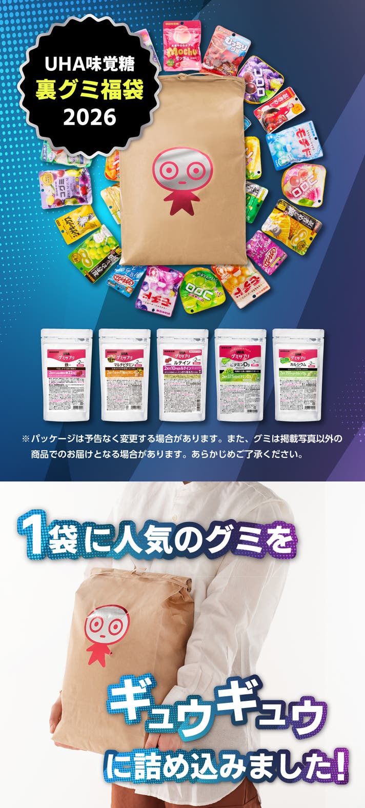 そして今回ENERGY ARTS(エナジーアーツ)新発売記念として「UHA味覚糖 裏グミ袋2026」付きを発売。シンボルキャラクター「UHA坊や」の特製米袋(5kg用)にかぶりなしのグミを約30種類をぎゅっと詰め込んでお届け。昨年発売初日で8,000個完売した大人気の福袋です(中身は届くまでのお楽しみ♪)