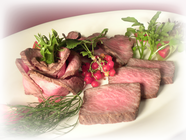 和牛の脂の乗った肩ロースともも肉と脂の全くない前足の部分をバランスよく合わせ、とっても食べやすい一品です。