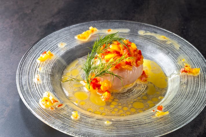 コース料理の中でも、真鯛のカルパッチョと低音調理のローストビーフの味は勿論のこと、見た目も鮮やかで記念日や会食などのお食事としてもふさわしいです。