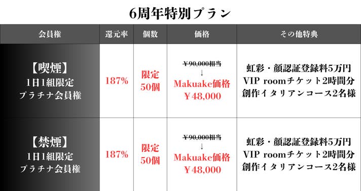 創作イタリアンコース2名様分、Barにご来店いただける権利、虹彩認証登録料(3万円)・顔認証登録料(2万円)、通常会員では使用できないVIPルーム利用権利全てを含めて90,000円相当のところ、Makuake価格48,000円でご購入いただけます。