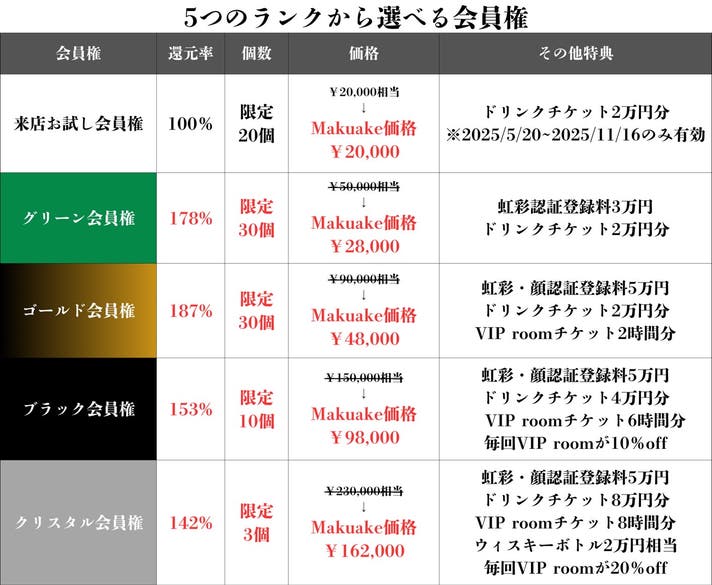 各会員権の数は限定数となっており、会員ランクに合わせて還元率が上がる超お得なプランとなっています。