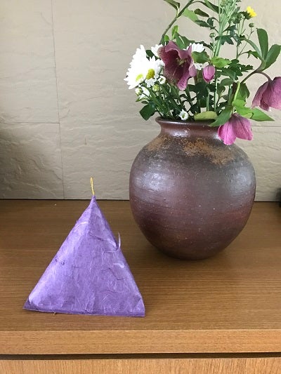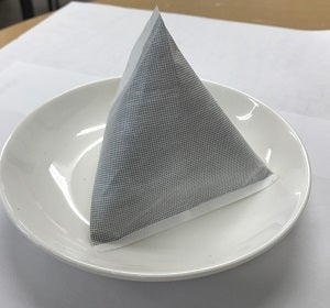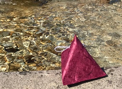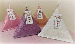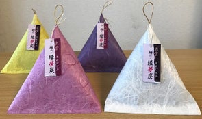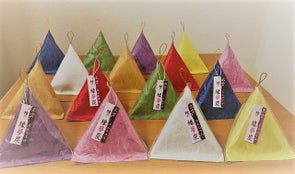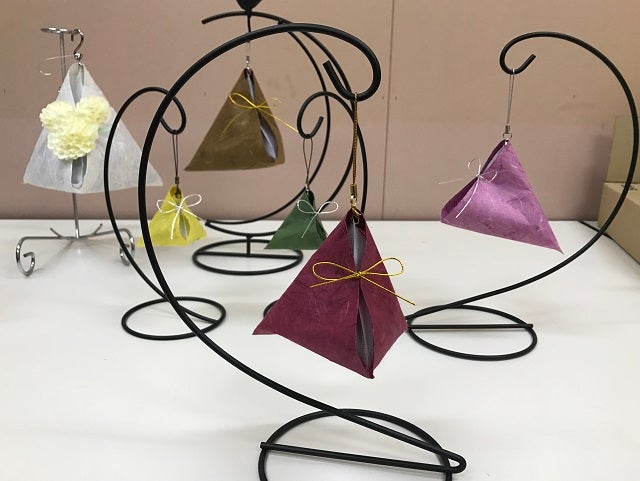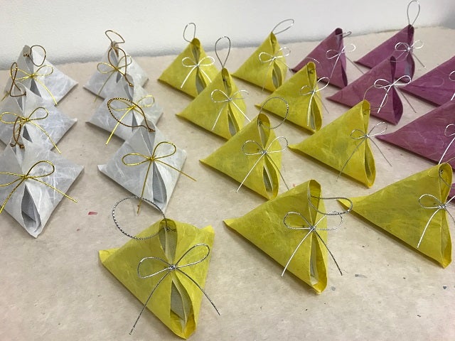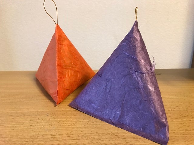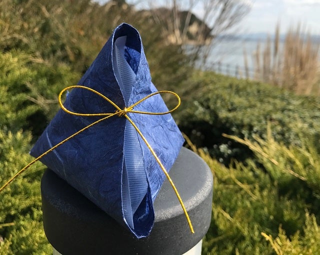 形状は外装和紙の開口部を一点止め(水引など)にして、中に入っている檜の不織布が見えるようにしています。外観形状は、神秘なパワーを生み出すと言い伝えられているピラミッド三角錐形状で、見た目にパワーの息遣いが感じられる外観になっています。