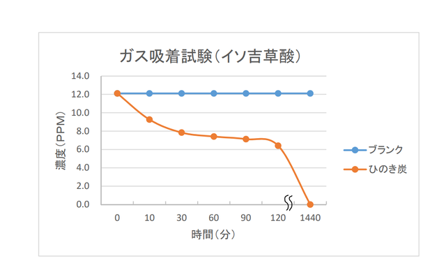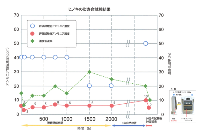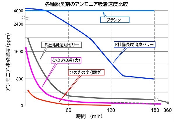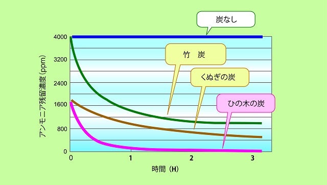 また、木炭は、表層部が塩基・酸基性に帯電しており、アルカリ性や酸性の臭いや有害な化学物質を引き寄せて吸着さるといわれています。檜の炭は、特にアンモニアの脱臭に優れ、木炭の中での比較のみならず、化学的消臭剤との比較においても同等以上の脱臭能力を持っています。アンモニアは、人の排尿や汗など人体からでる異臭に多く含まれており、檜の炭は人の生活に優しい脱臭炭として最適です。