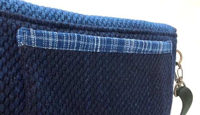 ボディの生地と同じ武州正藍染の格子柄。背面ポケットの縁取りに採用しています。