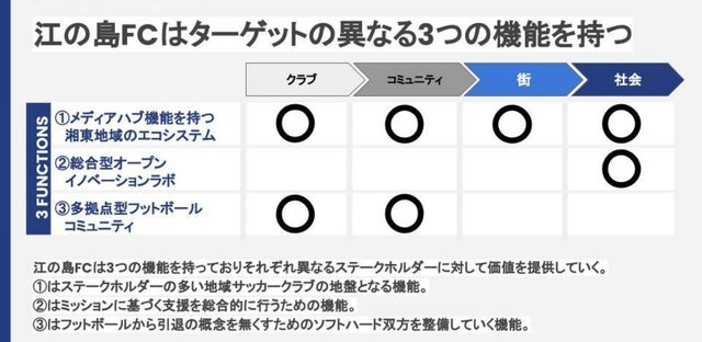 『総合型オープンイノベーションラボ』という側面では、人が夢を諦める原因を仲間・空間・知見・資金のといったハード面の不足にあると定義し、生活者に対する空間、仲間、知見、資金の総合的な支援を行い、機会格差解消に向けて活動していきます。特に、『ENOSHIMAFC HOUSE』という居住型クラブハウスの創設(2020年10月)や、『ENOSHIMAFC INCUVATION LAB』というファンド設立(2023年)など、サッカークラブの垣根を超えた活動を行っていきます。