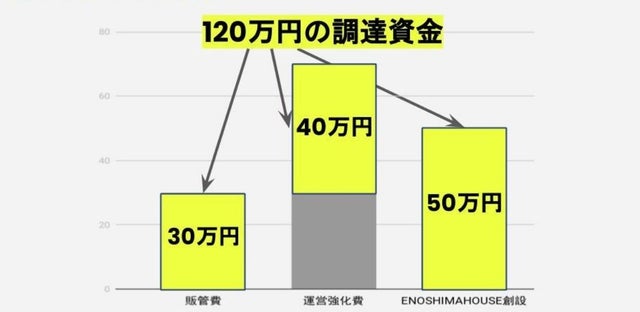 現在、江の島FCの運営資金70万円を自己資金で賄っており、コロナ情勢により予定通りの資金調達も行えていない状態です。今回のクラウドファンディングで150万円の目標を達成した場合、手数料をを差し引き、120万円の資金を運営費として調達できます。このうち、30万円を販売管理費(グッズ販管費・PR費用)、40万円を江の島FCの運営強化費(登録費・会場費・用具代)の補填、残り50万円を、江の島FCの居住型クラブハウスである「ENOSHIMAFC HOUSE」の立ち上げ費用に充てます。