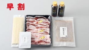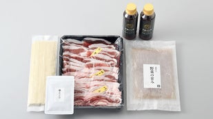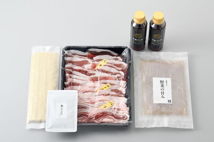 ■内容:いのしし肉300g(ロース90g/バラ60g/モモ150g)、濃縮出汁400ml、円奏ぽん酢200ml×2、鍋ふりかけ5g、中華麺160g