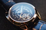 スケルトナイズされたトゥールビヨン・ムーブメントは、精緻な美しさを備えており、1分1秒を大切にしたいと思うほど、エレガントな雰囲気を醸し出します。