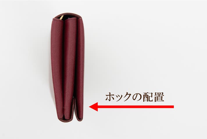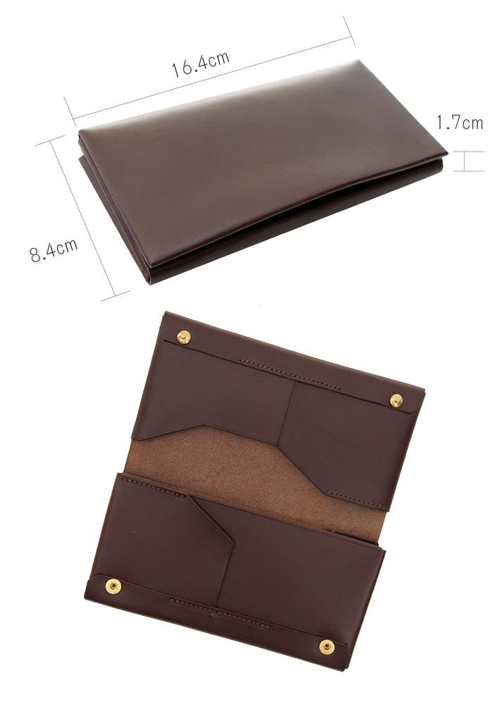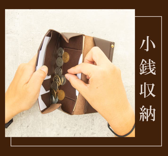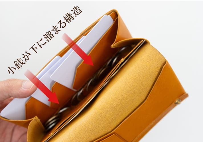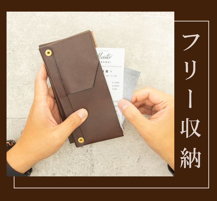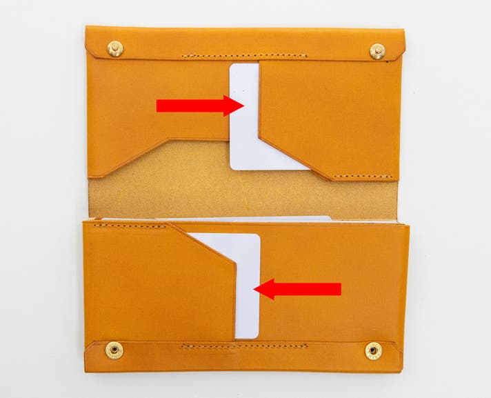 下部がホックで留められていることで自然な底上げ構造となり、駐車券やクーポン、カード類などもスムーズに出し入れ可能です。(上げ底なのでお札を入れるとはみ出します)