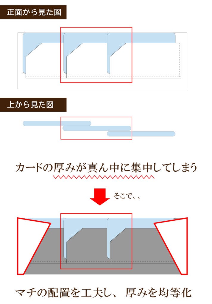カードの重なり厚くなる中心部分にマチがかさらないようにマチの形状を工夫し、厚みを均等化することができました。