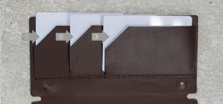カード収納は、財布内部に3ヵ所のスリット式収納を設置しました。最大で一つのスリットにカードを3枚収納(計9枚収納)できます。