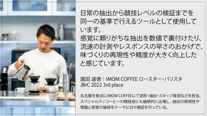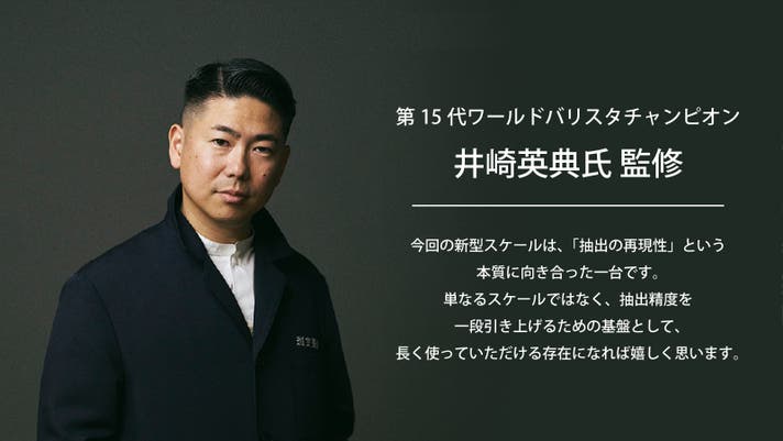 今回開発した新型スケールは、その「抽出の再現性」という本質的なテーマに向き合い、ワールドバリスタチャンピオンとしてコーヒー業界の第一線で活躍している井崎英典バリスタ監修のもと開発を進めた意欲作となります。
