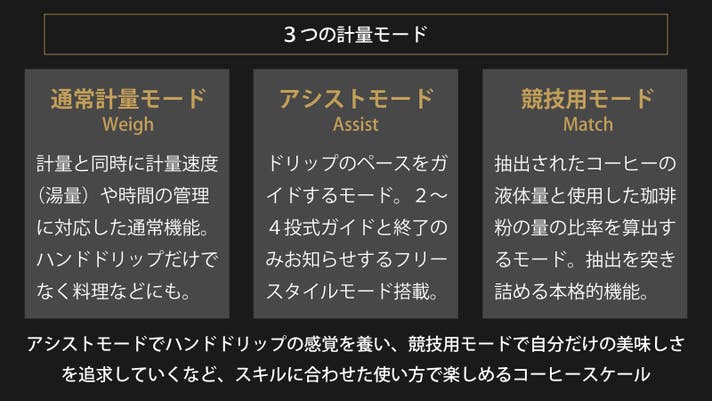 またアシストモード、通常計量モードの他、第三の計量モードとして搭載されている「競技用モード」ではドリップ完了後に使用した珈琲粉の量と抽出されたコーヒーの液体量から実際の抽出比率まで厳密に算出することが可能に。