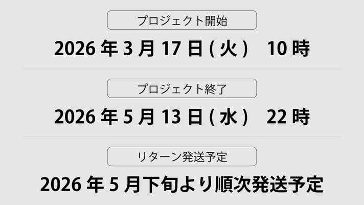 このプロジェクトはAll in型です。目標金額の達成に関わらず、プロジェクト終了日の2026年05月13日までに支払いを完了した時点で購入が成立します。