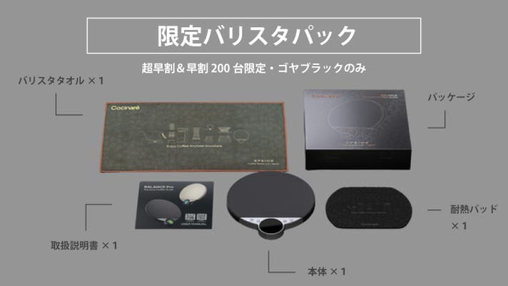 (※超早割および早割のバリスタパックについては、ゴヤブラックのみのご用意となります。その他カラーをご希望の場合は「MAKUAKE割」の通常版、「セット割」でお選びいただけます。)