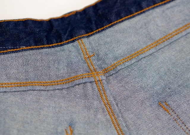 外脇側はビンテージ感を残すために、割りで始末しています。割りのロック処理部分も、ステッチ色を変えて耳付きの様に見せています。はき込んでいくと、割りのアタリが表に出てきます。