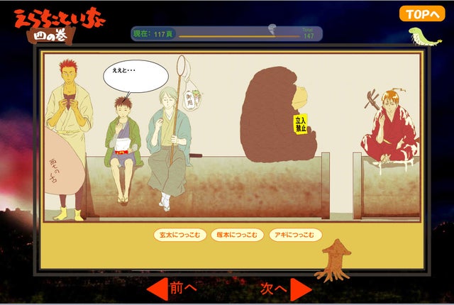 フラッシュFlashというのはアニメーションや音声の取り扱いができる表現力の高いツールです。オンラインゲームも大半がフラッシュで作られていました。『』はこのフラッシュで作られた全年齢対象フルカラーの和風ファンタジーコメディで、アイディアの核にあったのがフォトビューワーです。枠の中に入るのはイラストだけではありません。テキストもアニメーションも音源もあり、ページをくっていくとイベントが発生する、デジタルからくり絵本という仕様。ボタン等を設置し読者に参加してもらうことでインターラクティブなコンテンツになっていました。