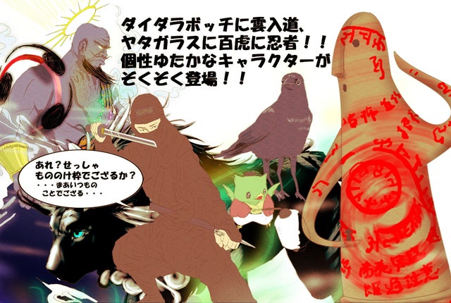 ※勝利をもたらすヤタガラス、創造する神話の巨人ダイダラボッチ、あなたの身代わりに凶運をせおってくれる占い忍者のいずれか一点がランダムで送付されます!