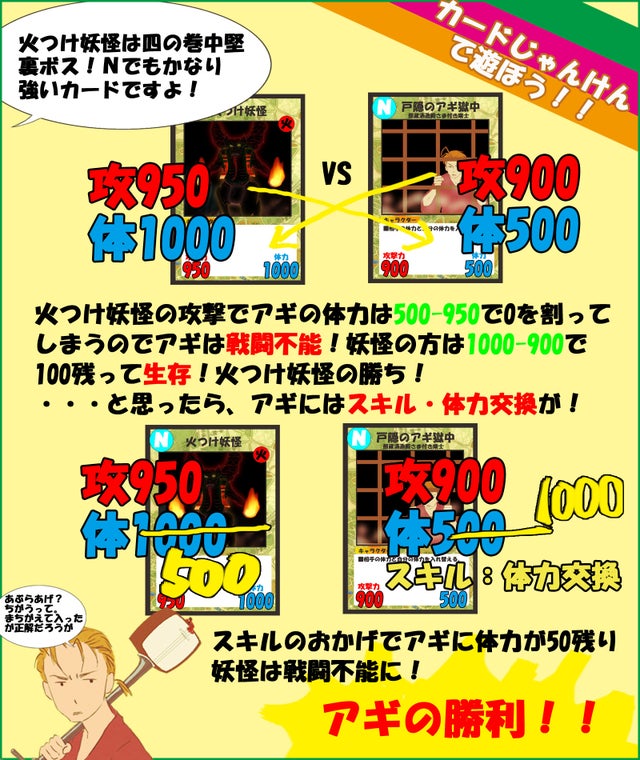 各カードには攻撃力と体力が設定されています。一対一の三回勝負で対決、じゃんけんの要領でカードを出しあいましょう。相手の攻撃力がこちらの体力、こちらの攻撃力が相手の体力をけずります。体力が0以下で戦闘不能。生き残ったほうが勝ちです!