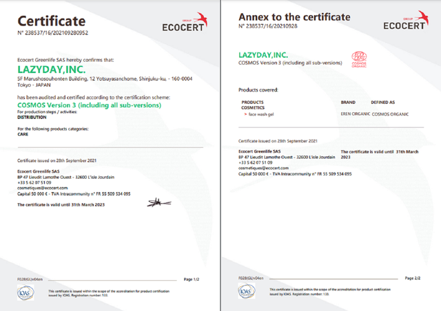 ECOCERT COSMOS ORGANIC認証取得