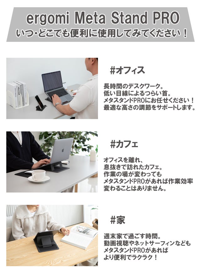 「ergomi Meta Stand PRO」がその悩みを解決してくれるアイデア商品だとおもい、メーカーとともに今回プロジェクトを企画しました。