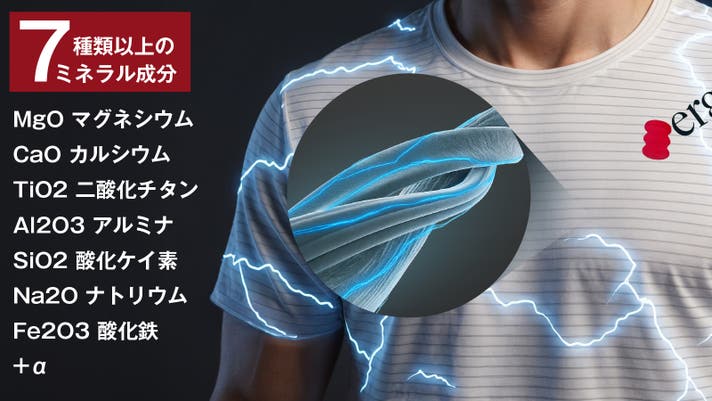 そこで、私たちが辿り着いた答えが、ミネラル鉱石+微弱電流を発生させる複合新素材によるアプローチです。7種以上のミネラル成分と導電性を併せ持つ複合繊維を採用し、やわらかな肌ざわりと、快適な保温性・通気性を両立した“新発想の機能性ウェア”を開発しました。