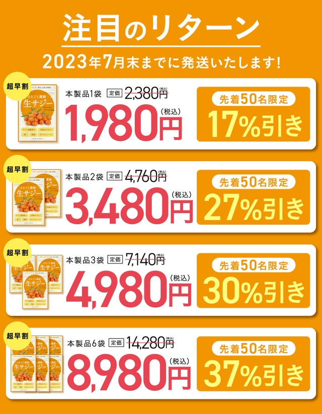 【先着50名限定】超早割!まるごと濃縮生サジー 6袋(180日分360粒入り)
