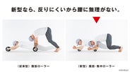 「腹筋・集中ローラー」は、前に伸ばしたときの接地ポイント(ローラーと足)の距離が短く、体が反りにくくなります。また、戻すときの腰の上下動が小さいためフォームが崩れにくく、腰への無理な負担やリスクが抑えられます。